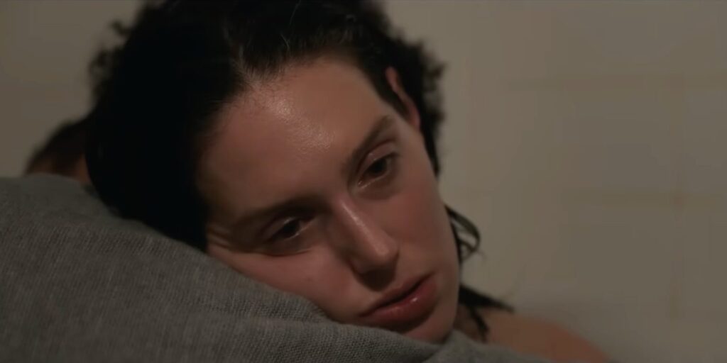 Não vemos seu rosto em close até este momento. A câmera a acompanha de costas, respeitando uma distância necessária. Quando finalmente a vemos de perto — molhada, exausta — ela tenta descrever o que aconteceu e entendemos que o filme não será sobre o evento em si, mas sobre o trauma.